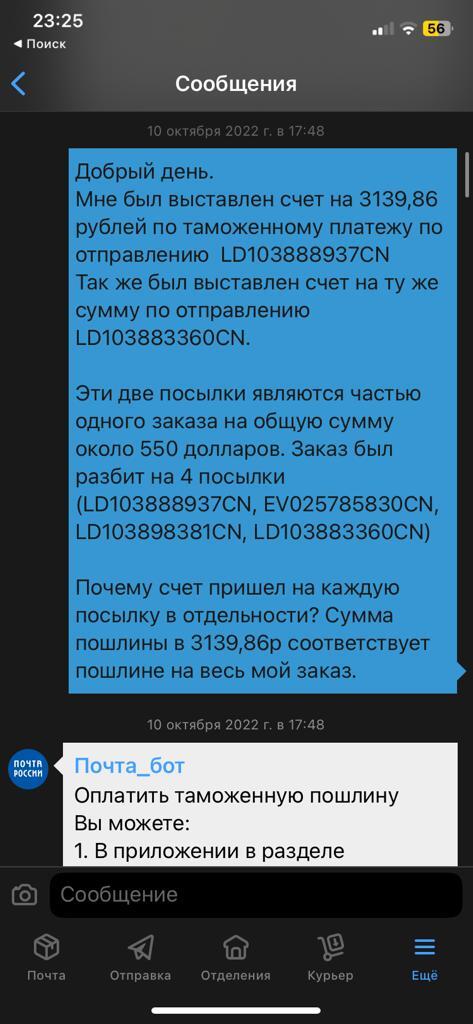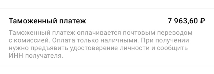 Начинаю считать. Получается, что пошлина должна придти была на общий заказ. И как раз на эту сумму. Но мне пришло на 3 посылки из 4-х.