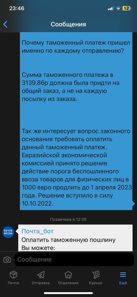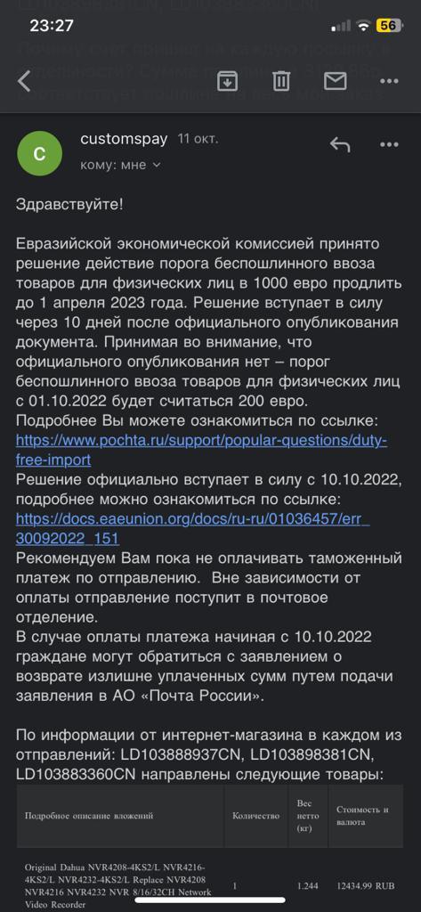 Я им про общение со службой поддержки. Про то, что с 10 октября продлили срок безпошлинного ввоза до 1000 евро.