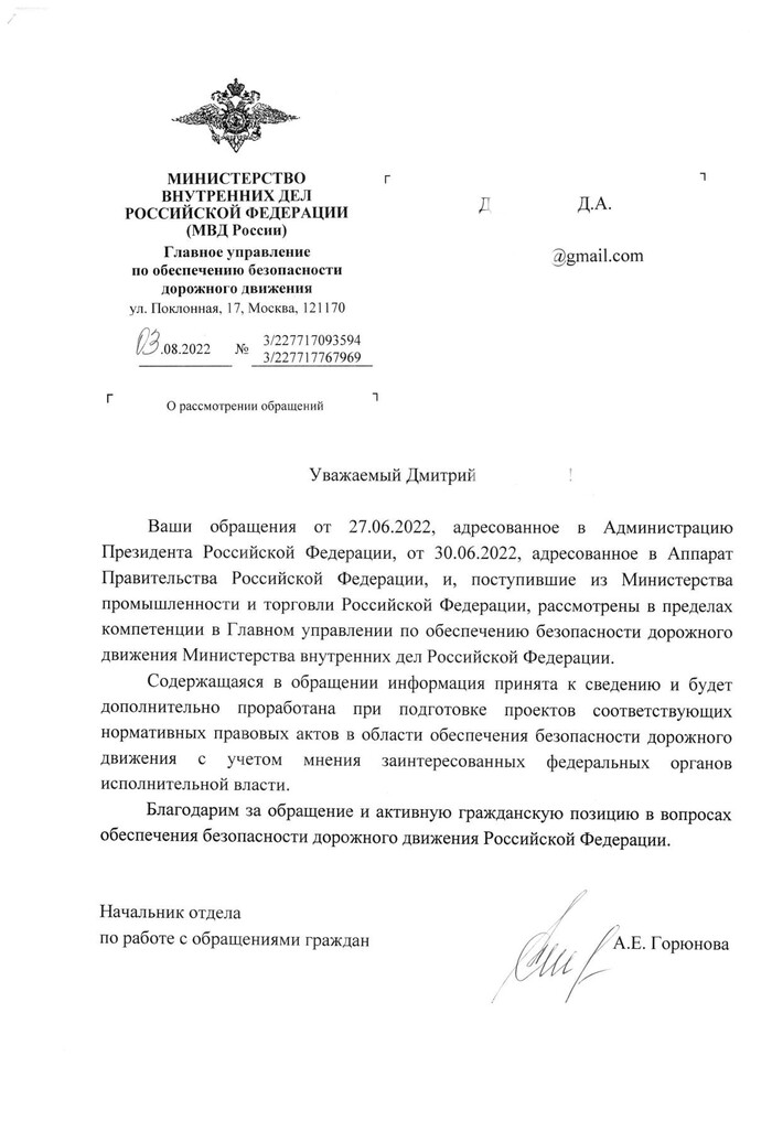 Желая привлечь внимание к проблеме и изложив предложения, которые могли бы оказаться полезны как для энтузиастов, так и для развития новых производств, мною было направлено два идентичных письма - одно в Аппарат Правительства, и второе - в Администрацию Президента. Оба письма затем были переданы в Минпромторг и МВД, откуда пришли идентичные ответы, поэтому ответы приводятся в одном экземпляре.