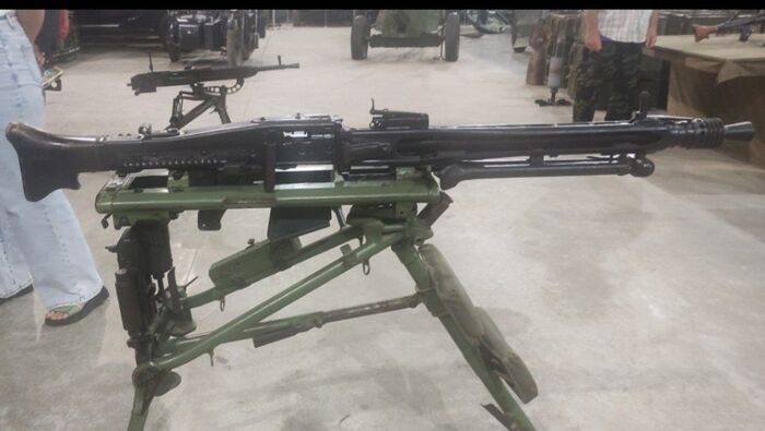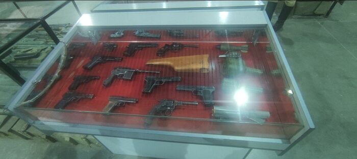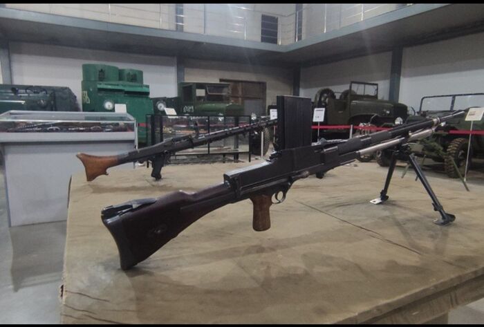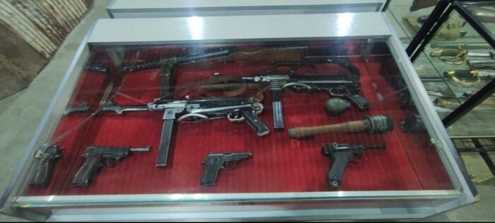На столе представлено много видов оружия, а именно: браунинг М1919, итальянская ПП «Беретта», американский Томпсон ППС-43, 3 вида ППШ-41, 2 с барабанным магазином и один с секторным, СВТ и 3 винтовки: одна Кар-98 и две мосинки, один карабин 38 года, также есть витрины с немецким оружием и пистолетами от Мп-40 и 38 до Люгера и Вальтера, а еще два кольта 1911 ТТ-33 и Маузер С96 ну и на последок в Ангаре представлены пулеметы мг-42 мг-34 дп-27 и дт-28 чешский и максим