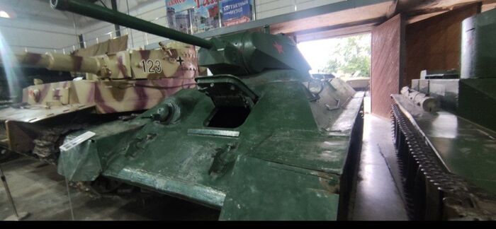 Ну и напоследок, т-10, последний советский тяжёлый танк, который тут представлен в своем худшем состоянии, у него отсутствуют часть катков, сам он ржавый, а в корме нет ничего