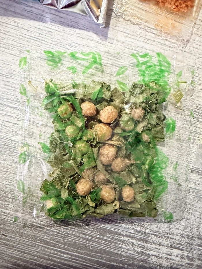 В наборе сама рисовая лапша, какое-то сладкое масло с запахом имбиря, перец с запахом имбиря, зелень и микро кусочки соевой курицы, тоже с запахом имбиря, и пакетик соли с молотым имбирем, естественно с запахом имбиря.