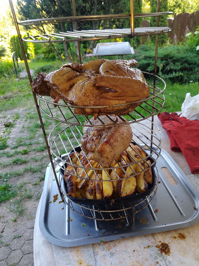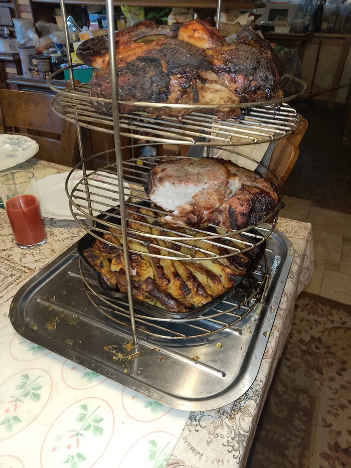 Через полчаса достаём этажерку из печки и снимаем фольгу с мяса. После чего отправляем обратно ещё на полчаса.