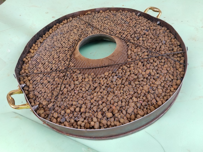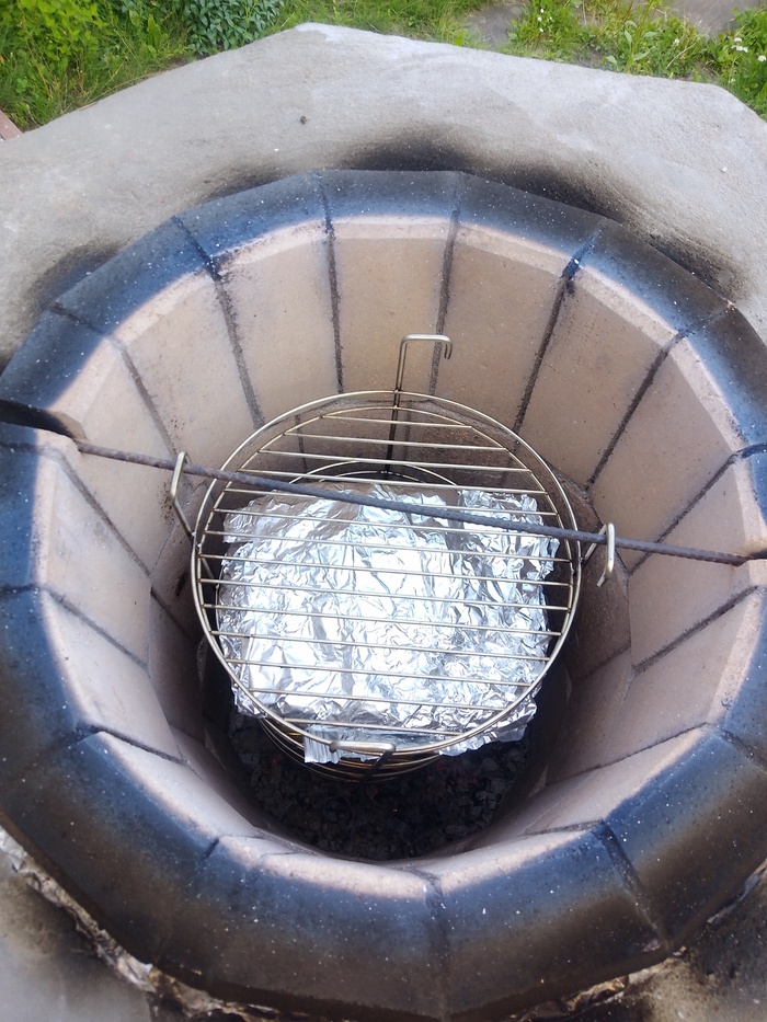 Подвешиваем этажерку в тандыр, используя в качестве перекладины кусок арматуры шестёрки. Полностью закрываем поддувало, а сверху на крышку ставим колпачок. В прошлом посте я забыл рассказать, что колпачок сделан из цветочного горшка и дверной ручки.