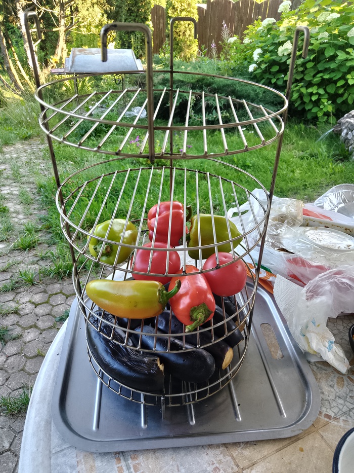 Тем временем накидывам на этажерку овощи, из них будут делать салат, пока готовится мясо.
