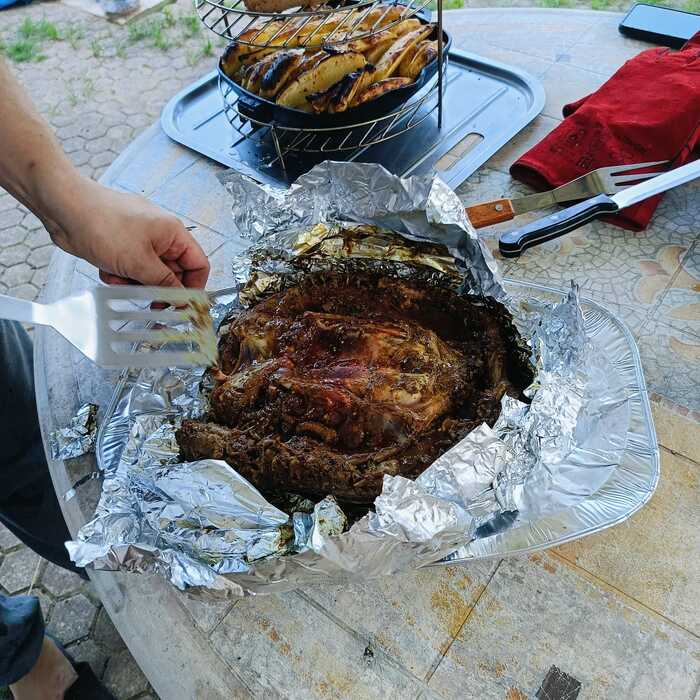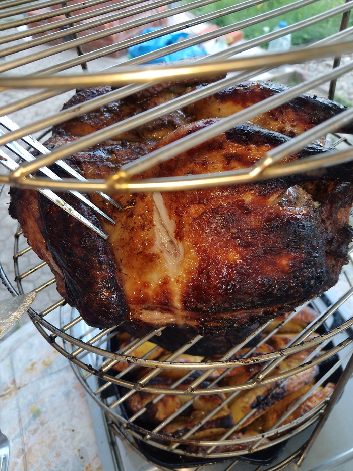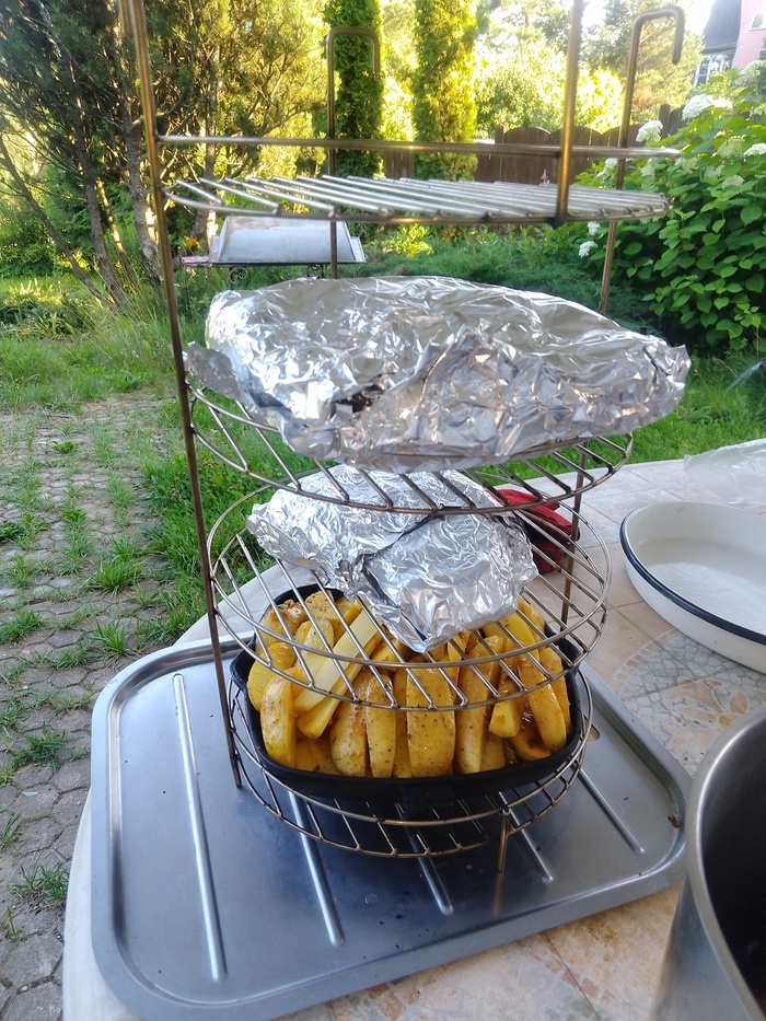 Сегодня у нас кусок корейки из 5-чки по акции и утка целиком, где-то добытая сестрой тёщи в честном бою. Мясо жена замариновала в соевом соусе со специями на несколько часов. Так же будет картошка, замаринованная в том же соусе. Корейку и утку мы заворачиваем в фольгу, а картошку укладываем на чугунную сковородку с отвинченной ручкой. Сковородку ставим на нижний ярус, чтобы в неё стекал жир с мяса: это добавит картошки вкуса и не даст пригореть.