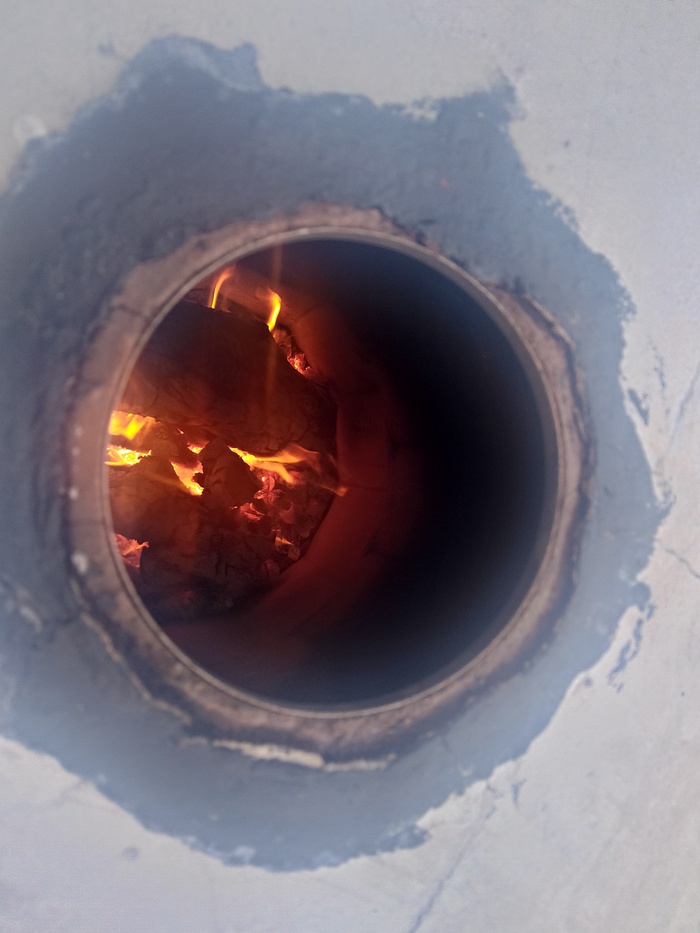 После того, как стенки начнут белеть, очищаясь от копоти, а дрова более-менее прогорят, закрываем тандыр крышкой.