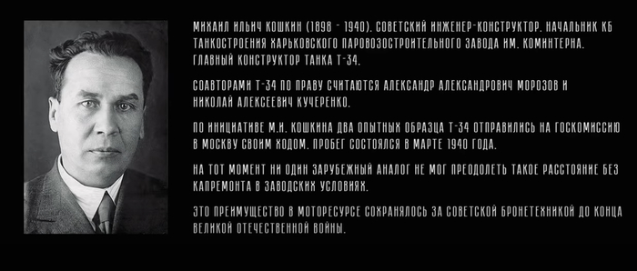 И вот Кошкин и Гаечка стоят находятся уже в Москве, Сталин с группой товарищей совершает обход рассматривая образцы техники. Увидев Кошкина без танков Сталин спрашивает:-А где же ваши танки, товарищ Кошкин? Конструктор стыдливо молчит. И тут как рояли из кустов, на брусчатку выезжают два танка Т-34. И киношный Кошкин, который танки бросил и сбежал, горделиво Сталину докладывает:- Два образца экспериментальных танка Т-34, своим ходом проделали путь от Харькова до Москвы. Танки проявили себя идеально во всех боевых испытаниях.