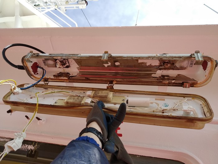 Электрики в работе. Проверка люстр, замена ламп. Кстати, лампы выделяют много тепла. Помню, у нас в погребе тоже была лампа, как её называли "сайровая". Использовали для сушки погреба и нагрева. Сайру тоже ловят на свет.