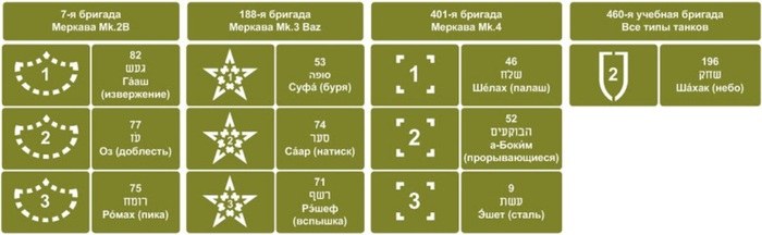 Если отойти от строгой иерархии нынешних трёх бригад, то путаницы становится намного больше. Есть 460-я учебная бригада, в которой одновременно находятся на вооружении все имеющиеся типы танков. Есть резервистские части, танки которых находятся на консервации, но иногда участвующие в учениях - там можно встретить и Магахи, и Меркаву Мк.1, а последнюю резервистскую бригаду Центурионов расформировали совсем недавно. В случае тотальной войны и полном призыве всех резервистов армия получит возможность формировать целые танковые дивизии и корпуса. В таких случаях и применяется последний тактический знак различия - контурный символ, упомянутый в предыдущем пункте.