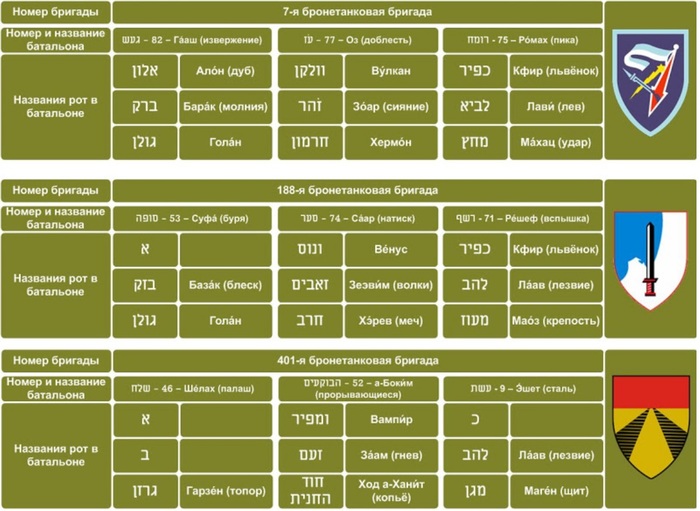Обратим внимание, что во втором столбце таблицы вписаны ивритские буквы. Теперь самое время вернуться к к первой таблице в статье, содержащей ивритский алфавит и рассмотреть порядок именования рот. Буквы в ней не зря разбиты на столбцы по пять - именно так делается сквозная нумерация рот внутри целой танковой бригады. В первом батальоне строевые роты будут называться алеф, бет и гимель, а в случае необходимости он обзаведётся ротами далет и хэй. Во втором батальоне бригады будут роты вав, зайин и хэт, а в третьем батальоне - роты каф, ламед и мем. Кроме номера в одну букву у каждой роты есть неофициальное название - это слово на иврите, начинающееся с нужной буквы.
