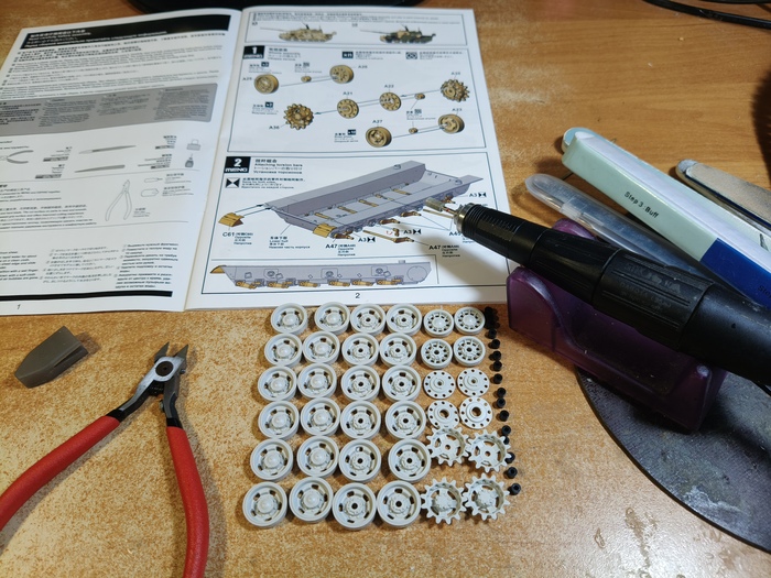 1.Сборка начинается с катков. Тут не много деталей, но в каждое колесо нужно вставить втулку. Продолжаем ванной корпуса и подвеской. Тут делаем торсионы. Они вклеиваются только у дальней стенки корпуса и потому работают как и должны. Два передних и последний опорные катки на сторону имеют дополнительный амортизатор, он также собирается без клея и остаётся подвижным. Гусеницы склеиваю супер-клеем, одеваются на катки они идеально, легко перематываются. Обработка деталей скальпелем, маникюрным фрезером и пилками. Клей сверхтекучий, обычный модельный и Revell Contacta, для винила - ЦА гель.