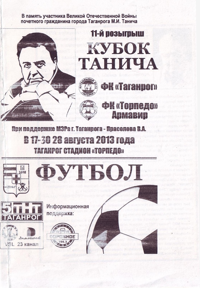 15 сентября, исполнилось 9х лет со дня рождения Михаила Исаевича Танича. Таганрожец всегда любил футбол. В его честь первый розыгрыш "Кубка Танича" прошёл 29 августа 2004 года, ко дню освобождения Таганрога от немецко-фашистских захватчиков.
