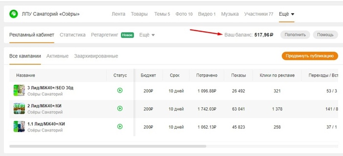Если же в самой группе вы также нажмете на кнопку «рекламный кабинет», то средства зачислятся на ваш аккаунт, а не на саму группу и управлять этим балансом сможете только вы, а не другие админы и рекламодатели группы Одноклассники.