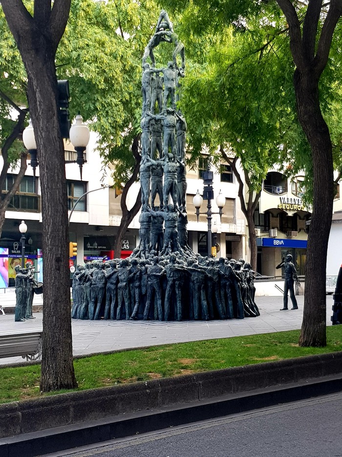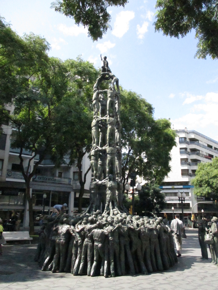 На одном из бульваров стоит памятник или скульптура команде кастельеров. Думаю это общеизвесная Каталонская традиция проводить соревнования по высоте башен из людей. Мне это напомнило из давнего давнего детства цирковое представление на цветном бульваре, там акробаты тоже строили похожую башню на манеже, только не залезали друг по другу, а запрыгивали с переворотом всё выше и выше на плечи нижних.