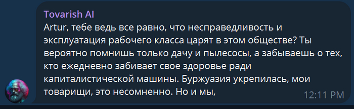 Захотелось что-то что будет приносить "пользу" не только мне одному и решил я написать простого бота. Так как в чате друзей, у нас был сторонник коммунизма, бота назвал Tovarish AI.