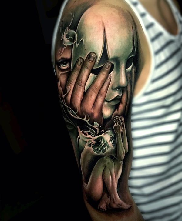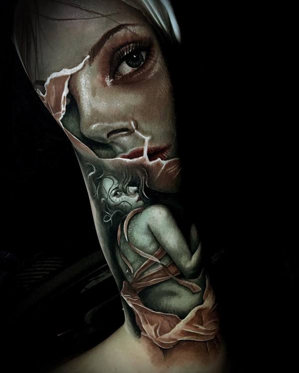 Первая тату-рубашка в моём исполнении. Делал более 8 лет назад для Александра. Довольно экстремально смотрится. Собирали её по частям, единого замысла сразу не было. Я почти все работы делаю так и финал зачастую становится сюрпризом для меня самого.