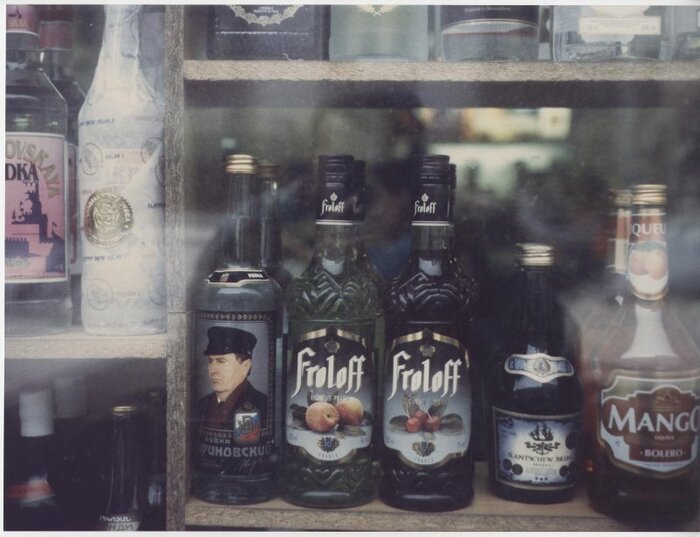 Алкогольный ассортимент в одном из ларьков, 1990-е годы.