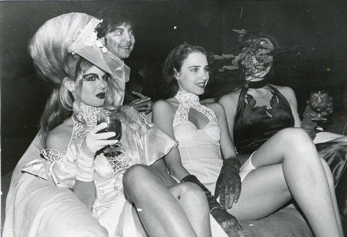 Участники кабаре-дуэта «Академия» Лолита Милявская, Александр Цекало и участники группы «Army of Lovers» на бизнес-презентации. Москва, 12 июля 1993 года.