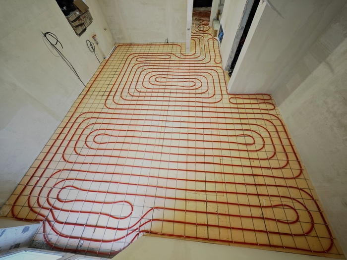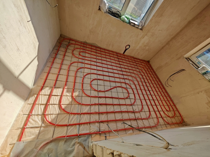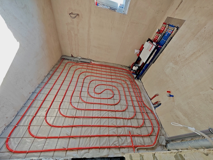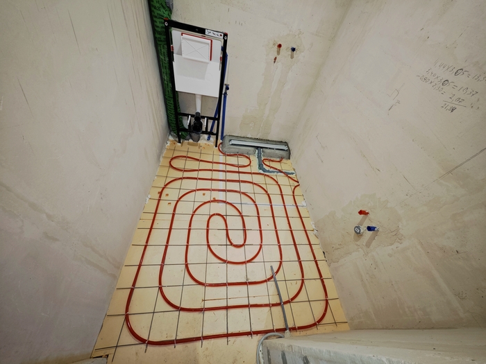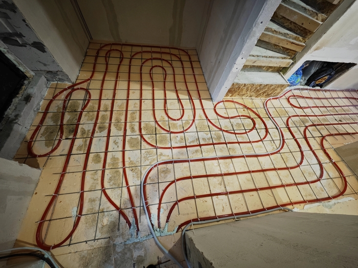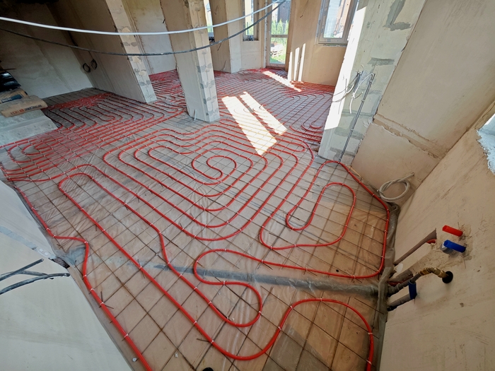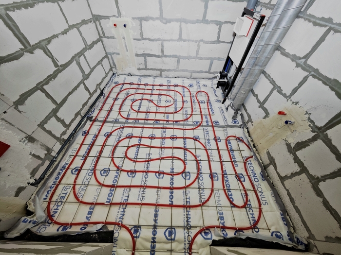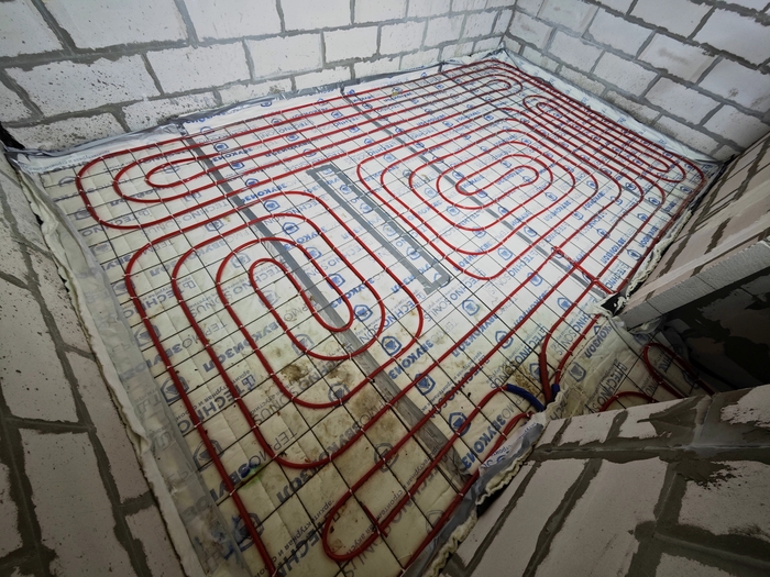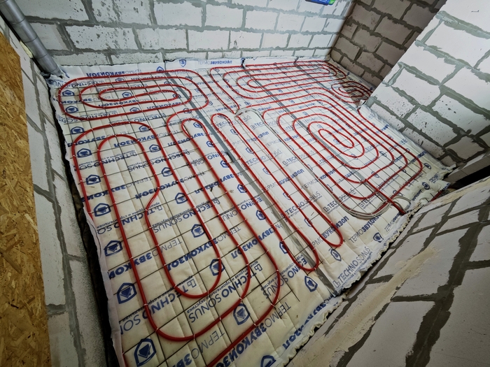 Изначально парни хотели пока классическое исполнение системы отопления в виде теплых полов под плиткой на 1 этаже и радиаторы в спальнях второго, но после моих объяснений и долгих обсуждений пришли к решению в виде монтажа только одной низкотемпературной системы отопления в виде теплых полов, которая является самой энергоэффективной.