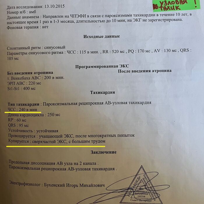 Частота сердечных сокращений 240 ударов в минуту, всё честно зафиксировано пока я лежал на койке. Нормальный диапазон это до 140. Ближе к 250 уже черевато остановкой сердца. Кайф этого исследования заключался ещё в том, что после того как мне запустили тахикардию, мне не могли её остановить. И тут представьте вы лежите вас штормит от ЧСС в 240 ударов в минуту плюс ещё потряхивают током через нос. В какой то момент я просто подумал, что отойду на тот свет вот так вот глупо... но... все кончилось и я минут 30 просто лежал и отходил в коридоре.
