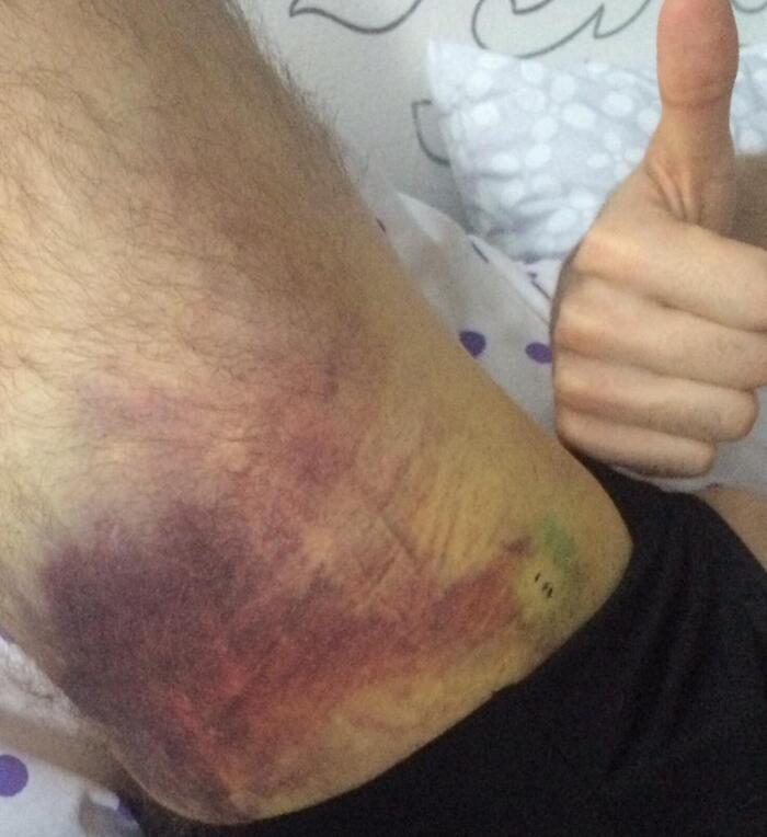 А это правая нога спустя 4 дня, а три дырки это место куда вставляли катетор. Болело так будто лошадь лягнула.