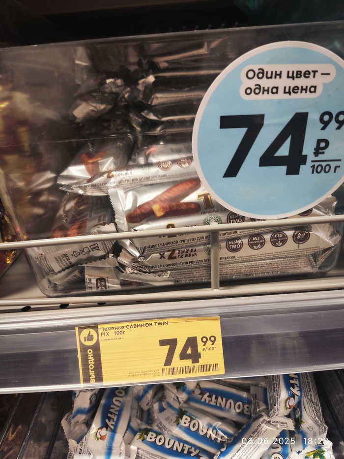 В голове промелькнула мысль что это замена Твиксу, но рядом лежат конфеты Баунти и Сникерс. Значит это импортозамещение? 🤔 попробуем. Но об этом чуть ниже.
