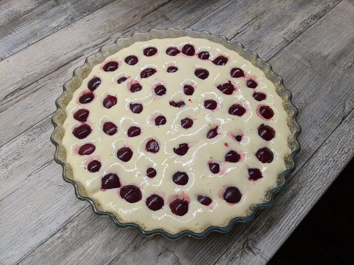 Очень люблю выпечку с сезонными ягодами или овощами. А у нас сейчас как раз пошла вишня! Честно говоря, попадется сладкая - я так сожру, мне никакой черешни не надо ))). Но вот муж принес пару килограмм кислой-прекислой!.. Я вживую ниасилил ). Даже детям показалось перебор. А в пирожок пустить - самое то. Пирожок без муки - я не худею и не боюсь глютена, но иногда хочется чего-то такого. А если кому-то важно, то вот ).