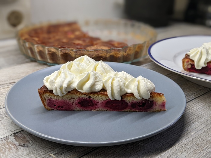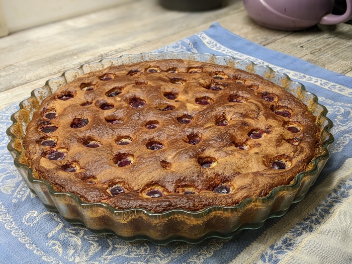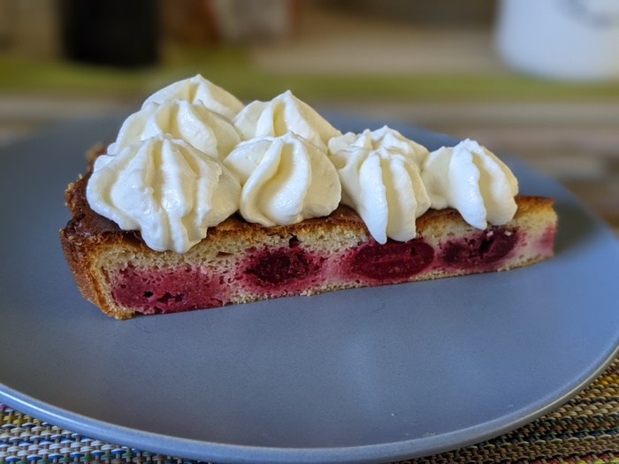 Рецепт совершенно не сложный, ингредиентов и усилий надо минимум, а результат очень достойный - мягкое, чуть плотноватое тесто, похожее немного на бисквит, кислые сочные вишенки и тающее облачко сливок. Впрочем, сливки это опционально.