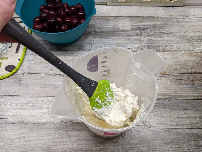 Нам нужно вмешать яйца - в творог. Не наоборот ). Потому что если мы бухнем плотный творог в яичную пену и начнем мешать, мы потеряем всю воздушность, зато получим комки. Поэтому постепенно, понемногу, в творог аккуратно вмешиваем яичную массу.
