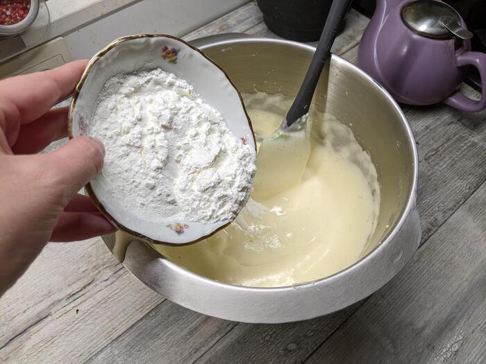 А этот крем уже легко смешается с яйцами. Сюда же добавим крахмал, опять все осторожно перемешаем - и получим тесто, похожее на бисквитное.