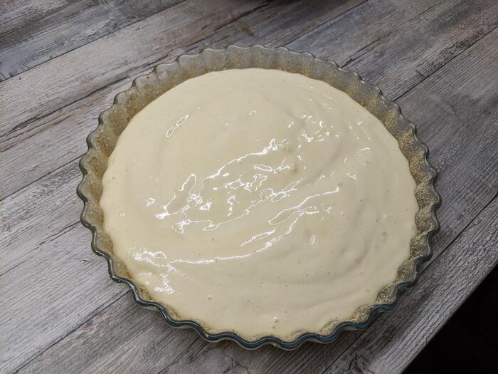Обратите внимание - сначала теста в форме совсем мало, после добавления ягод его уровень станет выше. Но вообще пирог не высокий. В духовке он немного поднимется, но потом осядет, это так должно быть.