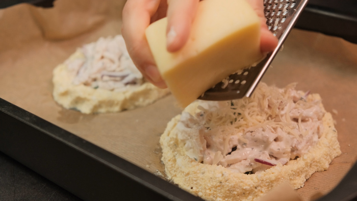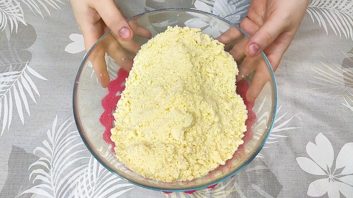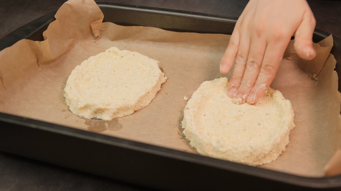 В глубокую миску всыпаем муку, разрыхлитель, соль, сахар , перемешать все ингредиенты. В сухие ингредиенты добавляем холодное сливочное масло и руками перетираем в мелкую крошку. В полученную крошку вливаем кефир, добавляем желток и быстро замешиваем мягкое тесто. Готовое тесто перекладываем на пищевую пленку и убираем в морозилку на 30 минут.
