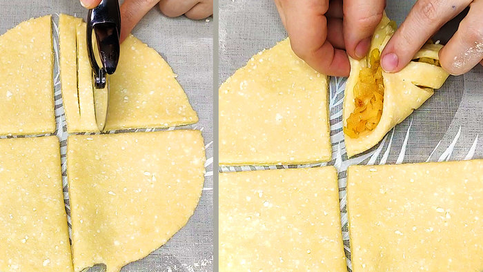 Стол присыпаем мукой, достаем тесто из морозилки и делим на две равные части. Каждую часть раскатываем в прямоугольный пласт, смазываем творожной начинкой и заворачиваем в рулет. Закрученные рулеты придавливаем немного рукой и разрезаем на треугольники.