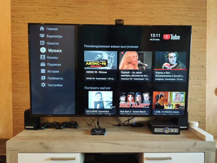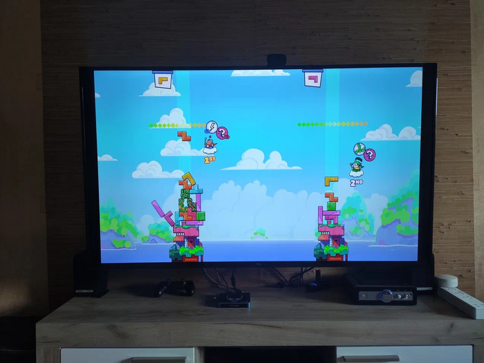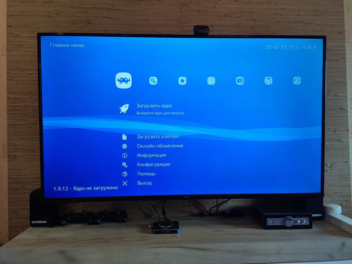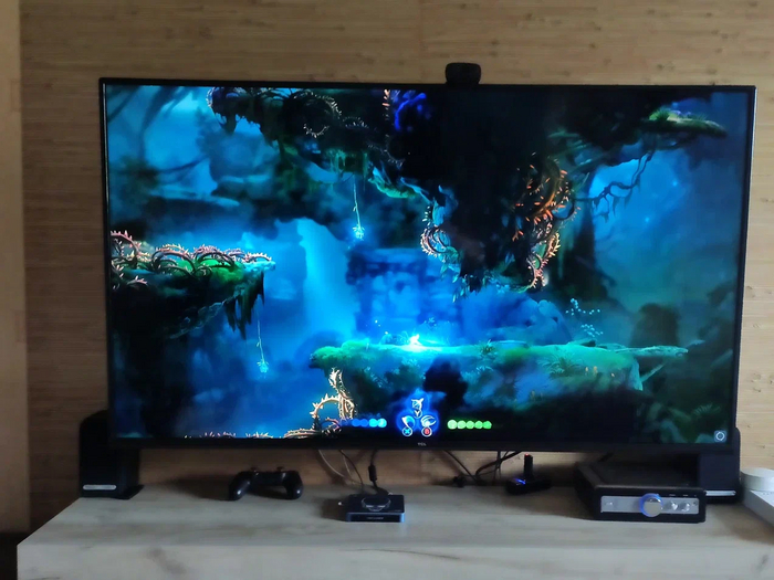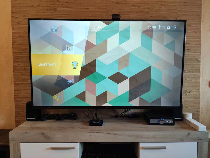 Подумали насчёт звука. В планах поставить саундбар с сабом. Но пока поставил 2.1 колонки от ПК.