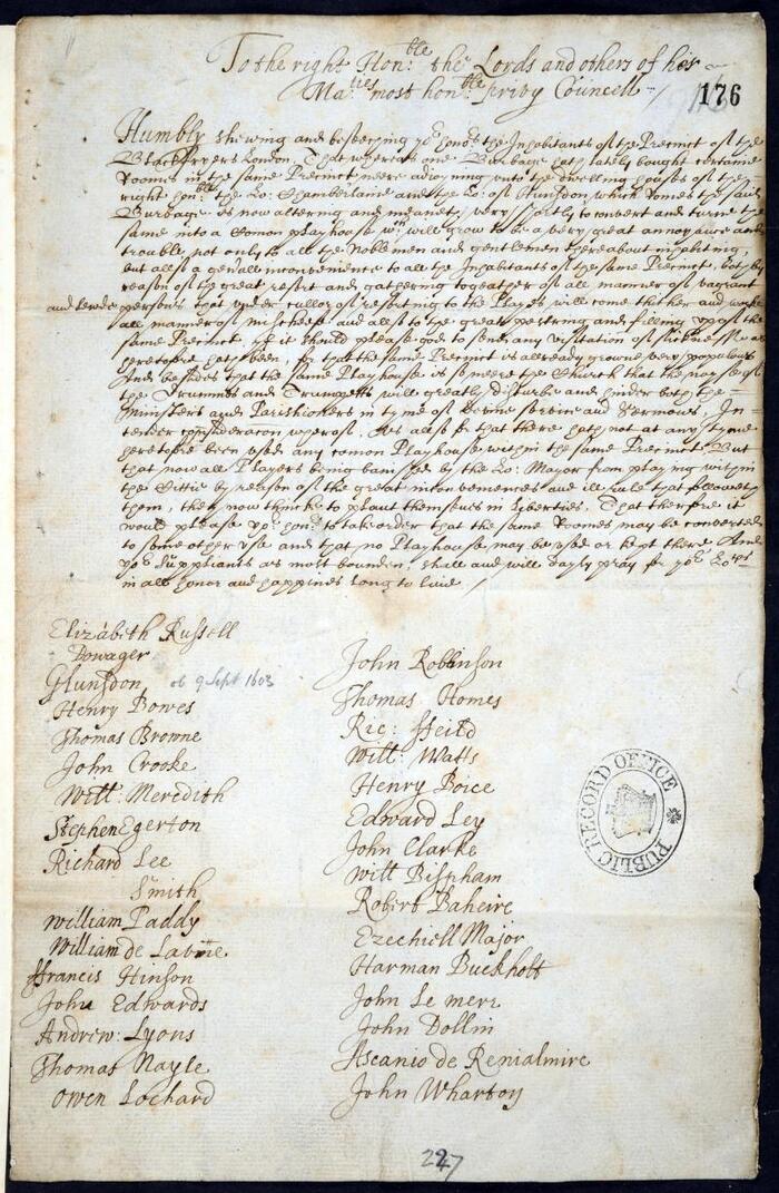 В ноябре 1596 года жители лондонского квартала Блэкфрайерс подали петицию в Тайный совет. Они были категорически против того, чтобы в их районе открылся театр. Документ сохранился в архивах — правда, не оригинал, а копия, сделанная около 1630 года. Но история, которую он рассказывает, напрямую касается самого Уильяма Шекспира, хотя его имя там не упомянуто.