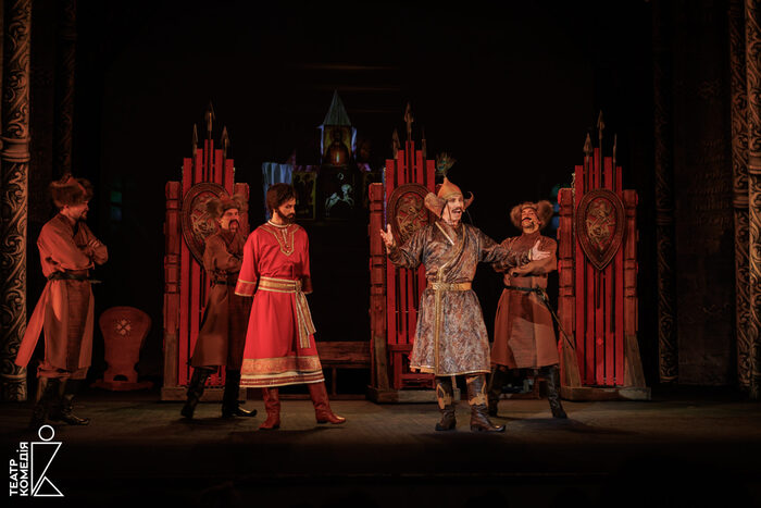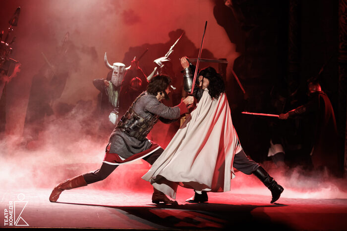 Даже не буду говорить про мое нелюбимое: песня / нормальный диалог / протягивание слов — криво, но в рамках жанра. Нооо "эпичный мюзикл" является закосом на оперу. Оперу в театре "Комедии". Уже странно, да? В театре, где... где безусловно талантливые артисты, но ни разу не оперные певцы. Кто-то не попадает, кто-то не тянет, при вполне себе хороших голосах... для обычного исполнения.
