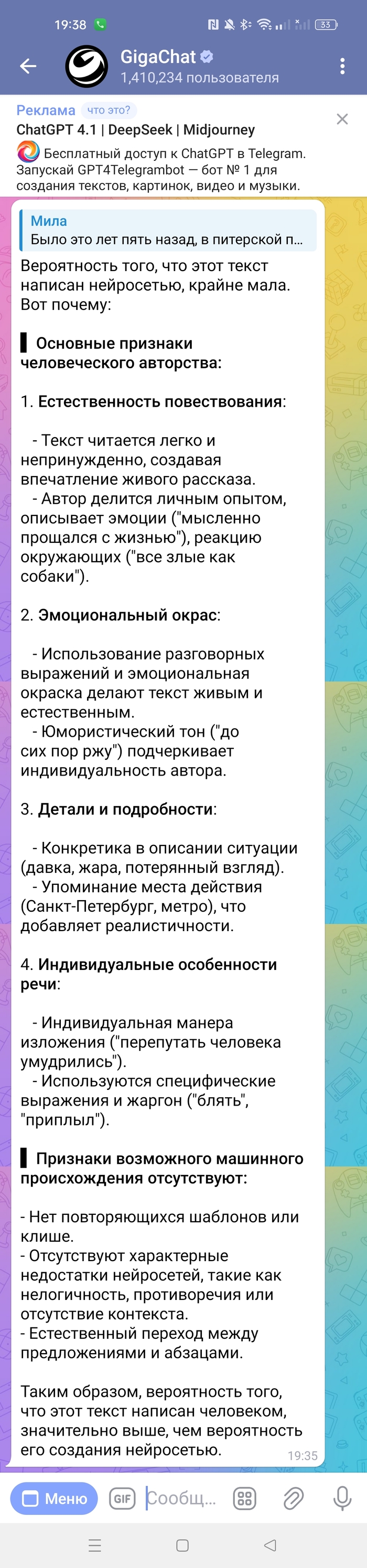 Беру этот же текст, и отправляю его в GigaChat, прошу так же проанализировать.