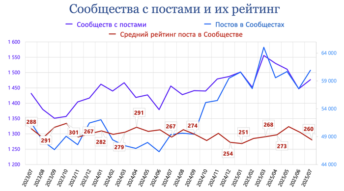 Пользователей, оформивших подписки на авторов или сообщества, на конец месяца было 1 757 978 (на 10 470 больше предыдущего). Суммарно число их подписок составило 21 064 067, из них 6 602 537 (31 %) на сообщества.