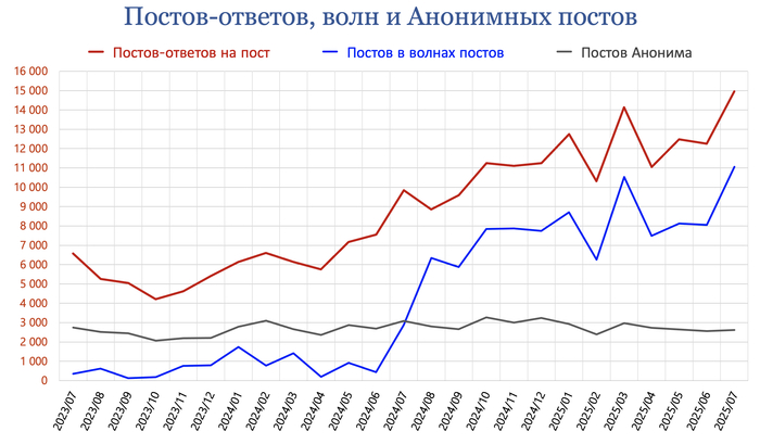 Постов-ответов на пост написано 14 962 (12,5%, на 22% больше к предыдущему месяцу).