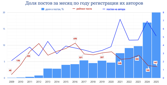 Средний рейтинг постов таких пользователей - 155, (у всех постов на Пикабу - 253,6), комментариев к постам - 16,8 (у всех - 31,4), просмотров постов - 28 662 (32 139).