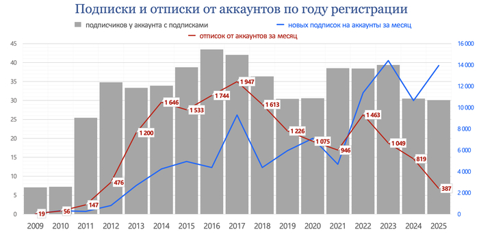 На конец месяца удалили свои аккаунты и не вернулись 1 970 пользователей (в прошлом месяце - 1 983). Восстановили аккаунты 321 (в прошлом месяце - 143). Переименовали свои акки 171 (в прошлом - 209).