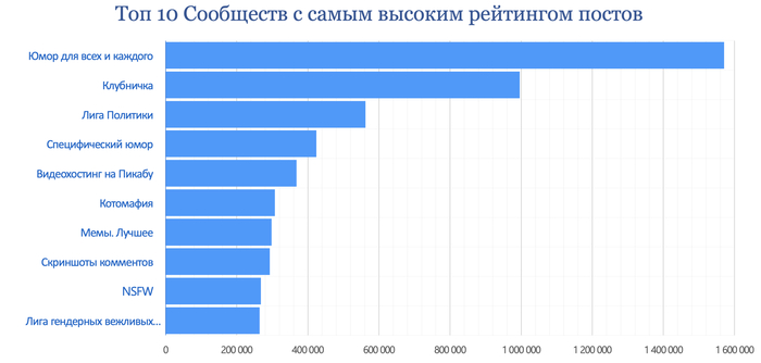 NSFW - 2 799 постов за месяц, Юмор для всех и каждого - 2 570 постов за месяц, Противозачаточные шутки - 2 140 постов, Клубничка - 1 421, Аниме[18+] - 1 352, Котомафия - 1 165, Лига Политики - 1 061, Аниме - 1 052, Видеохостинг на Пикабу - 1 047, Лига гендерных вежливых срачей - 740.