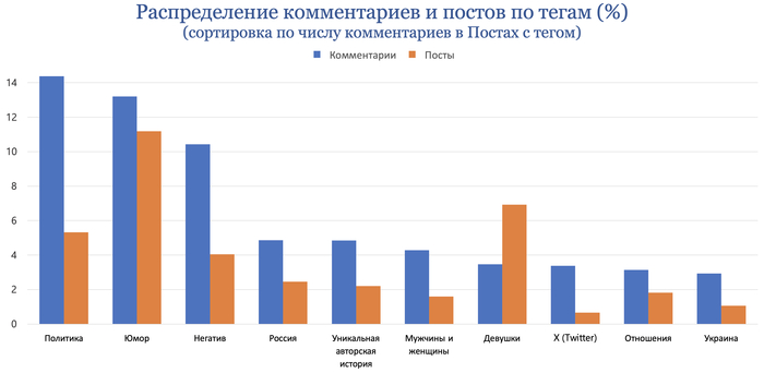 'Юмор', постов от всех - 11,6%, в Горячем - 15,9%