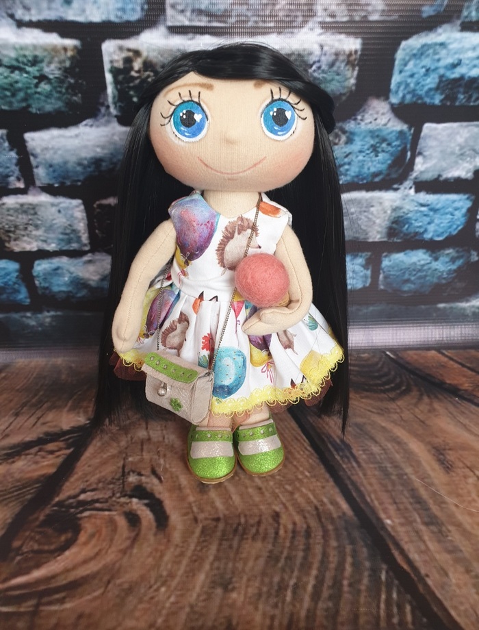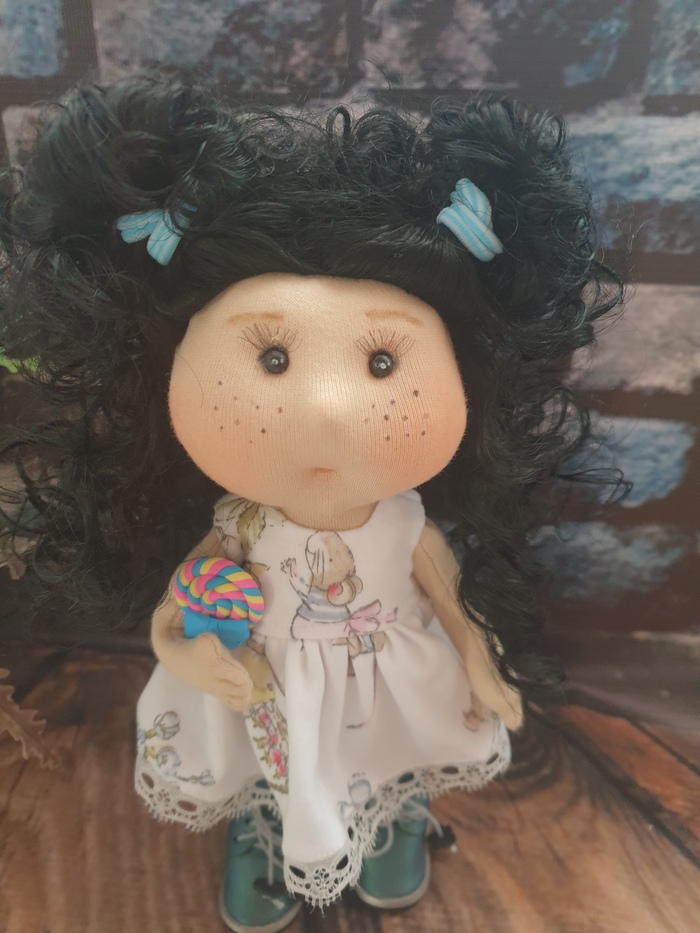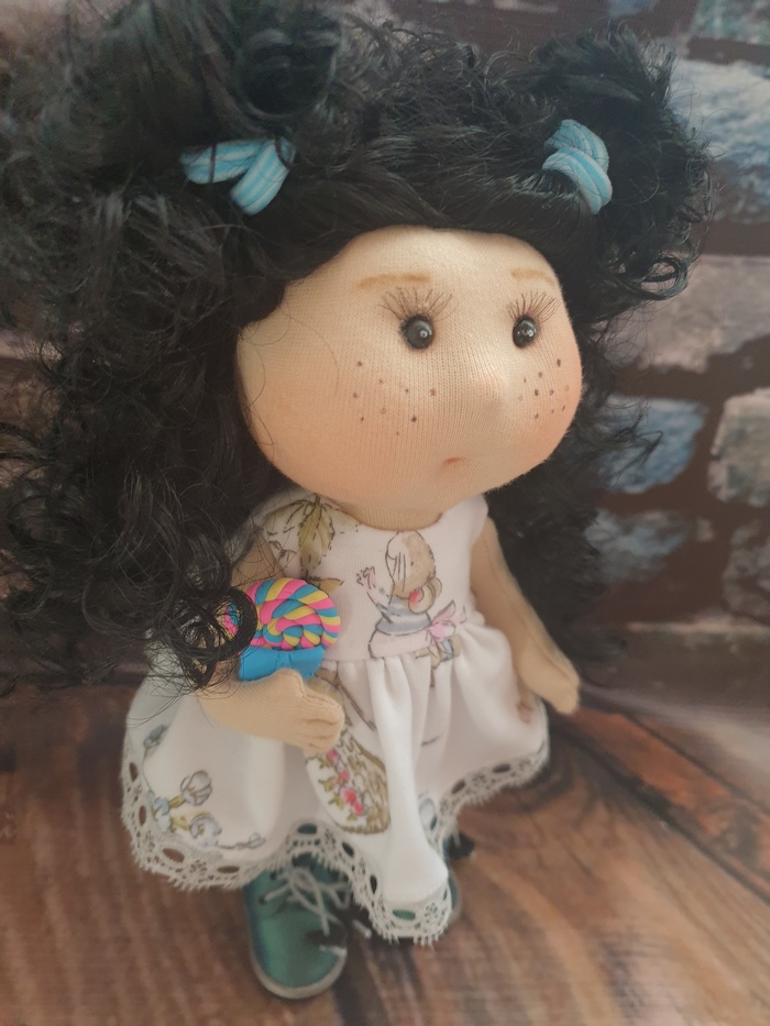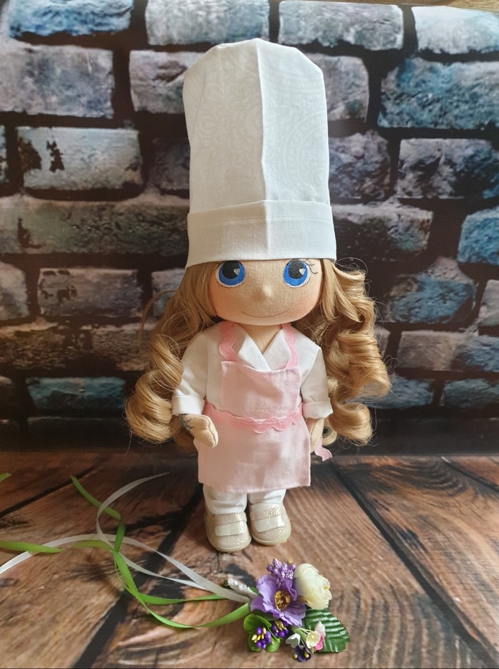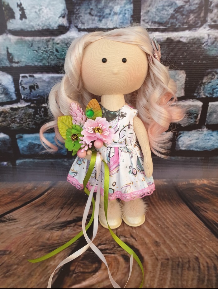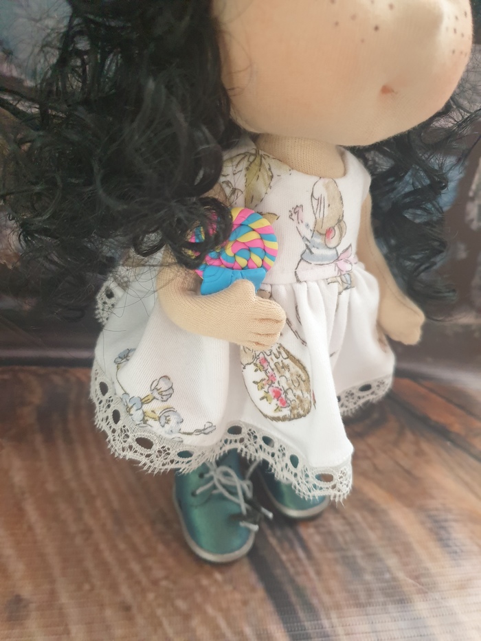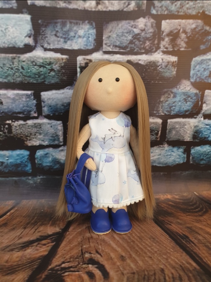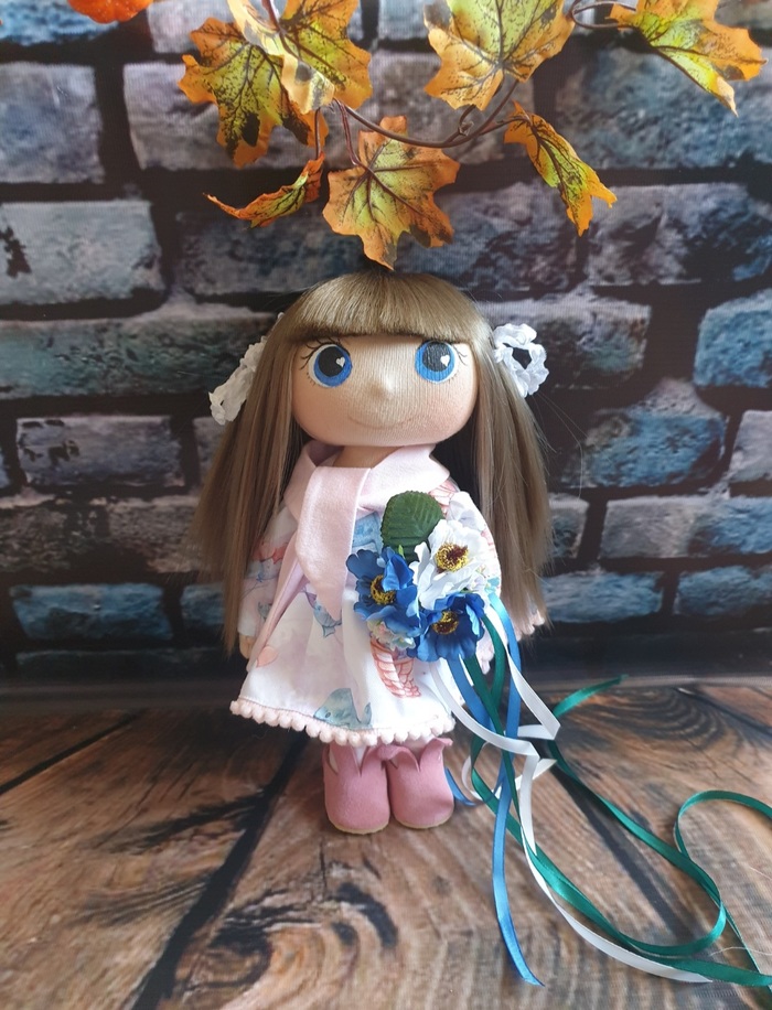 Себестоимость куклы - около 400 рублей, самое дорогое - волосы (заказывала где-то на озоне вроде). Для лица использовались термонаклейки. Высота сантиметров 30, на одну куклу ушло 2 дня - день на тело и день на одежду.