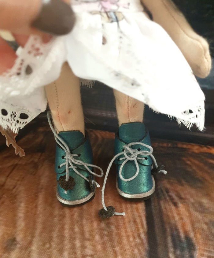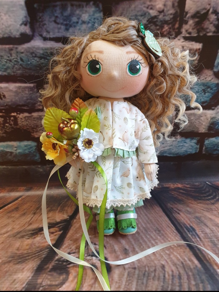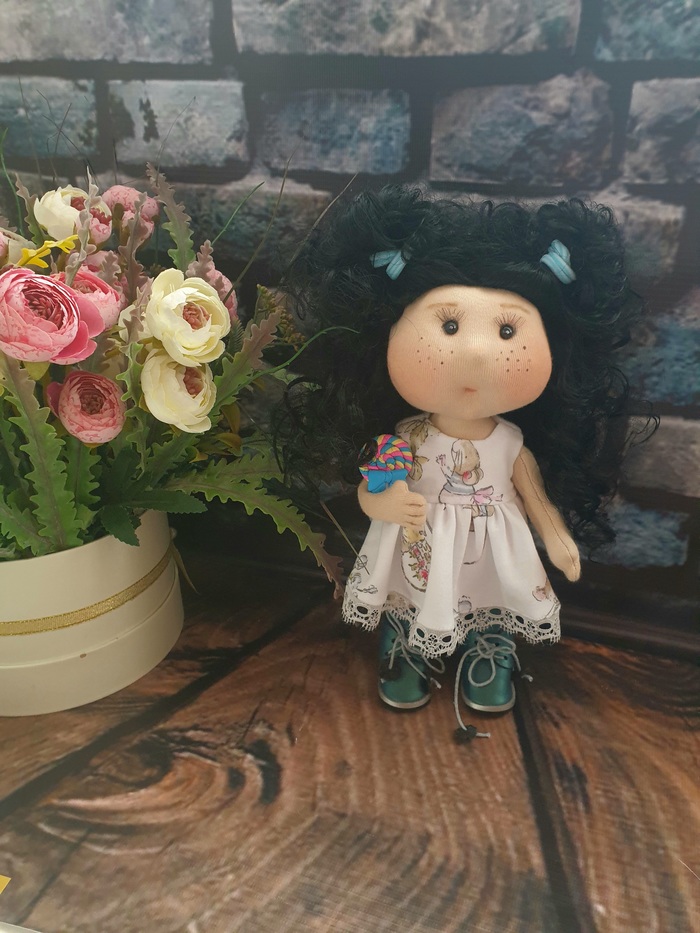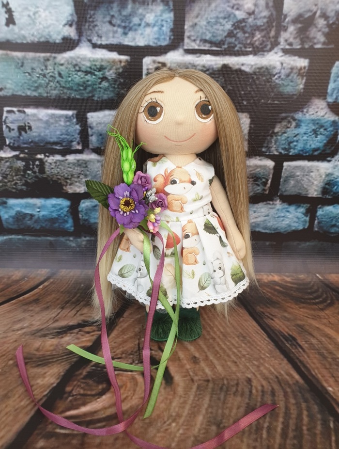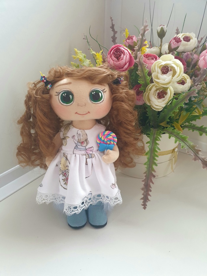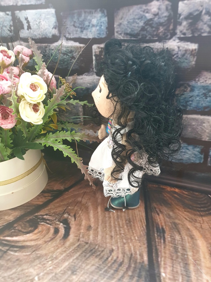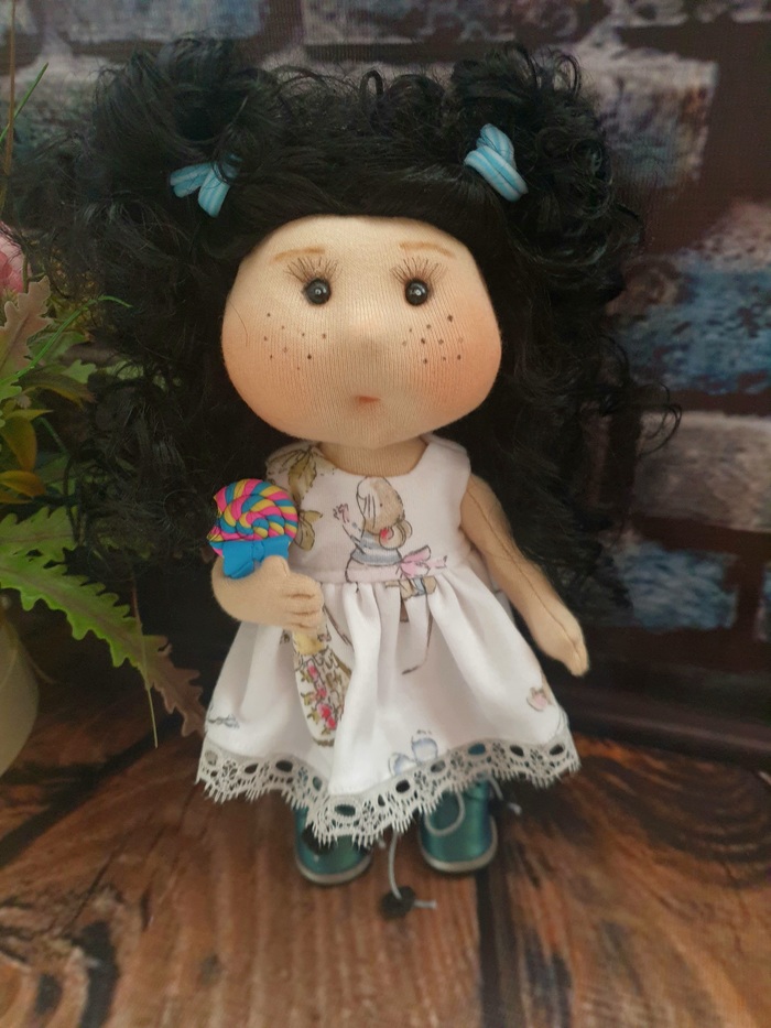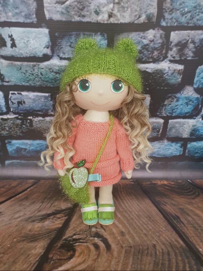 Себестоимость куклы - около 400 рублей, самое дорогое - волосы (заказывала где-то на озоне вроде). Для лица использовались термонаклейки. Высота сантиметров 30, на одну куклу ушло 2 дня - день на тело и день на одежду.