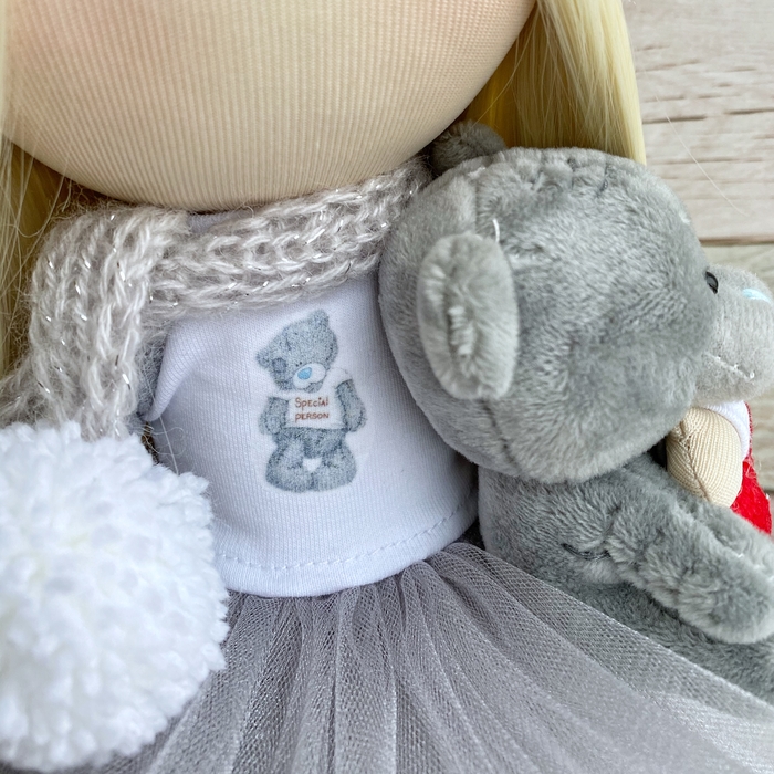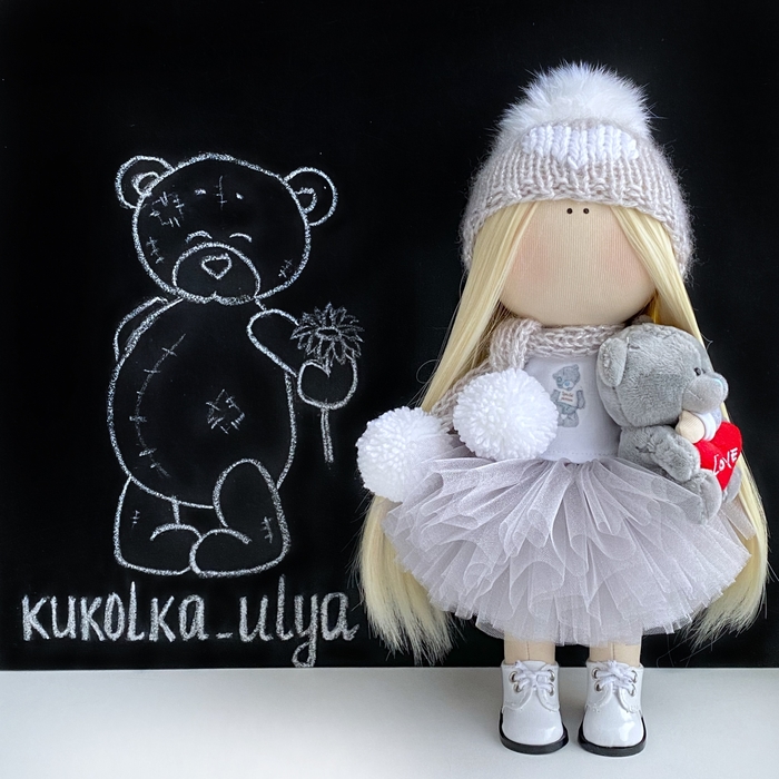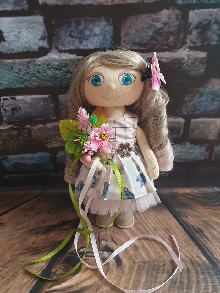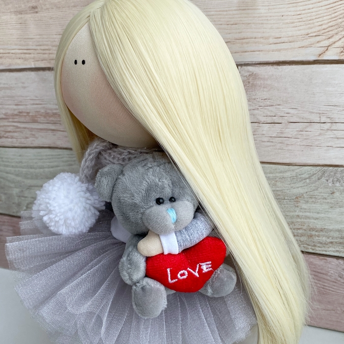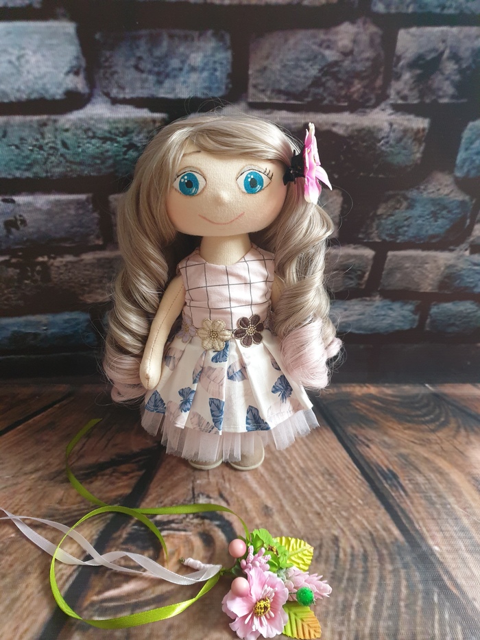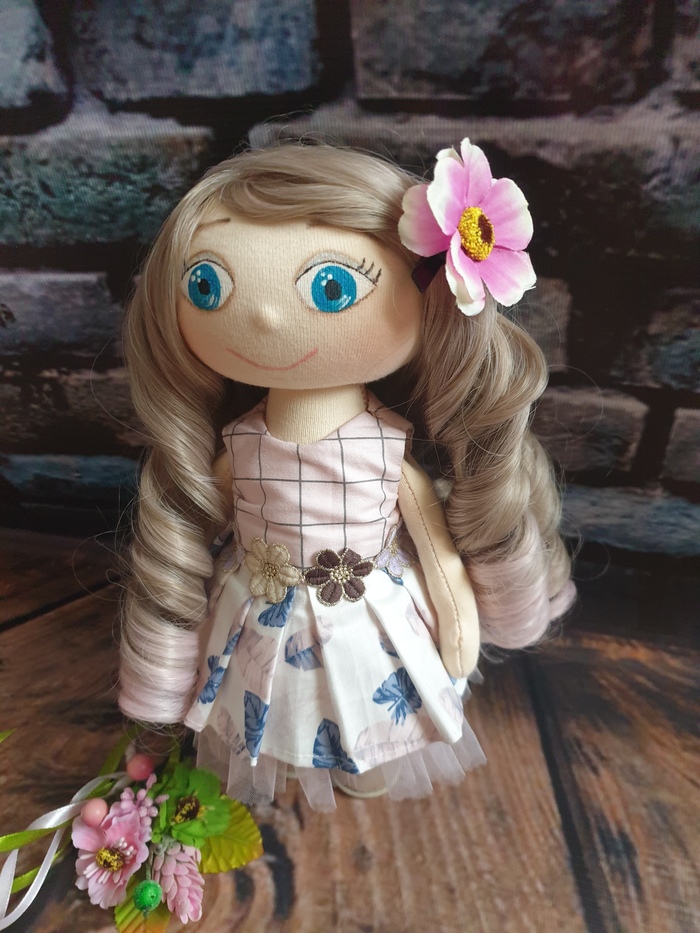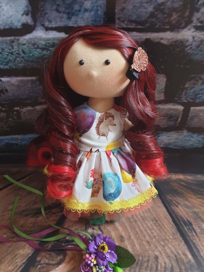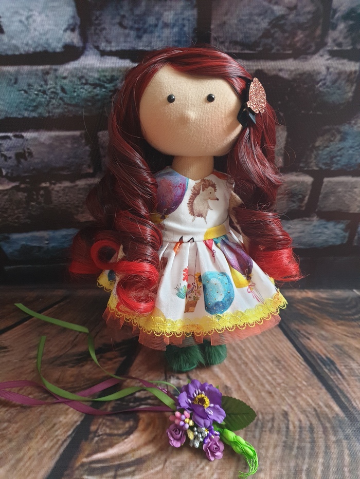Сделан из хлопка, набивка - синтепух, волосы - тонкая шерсть. Рост 31 см.