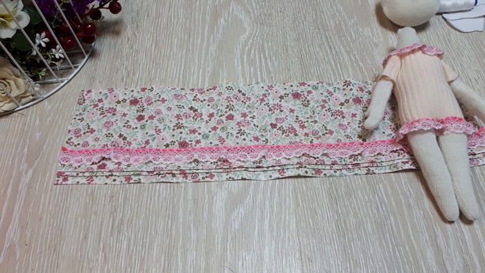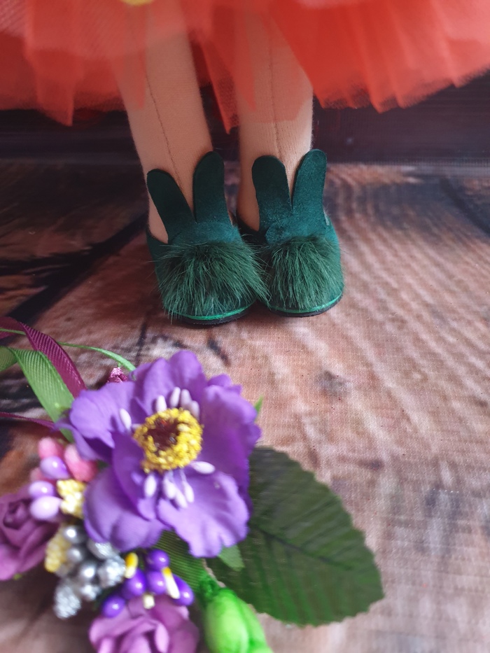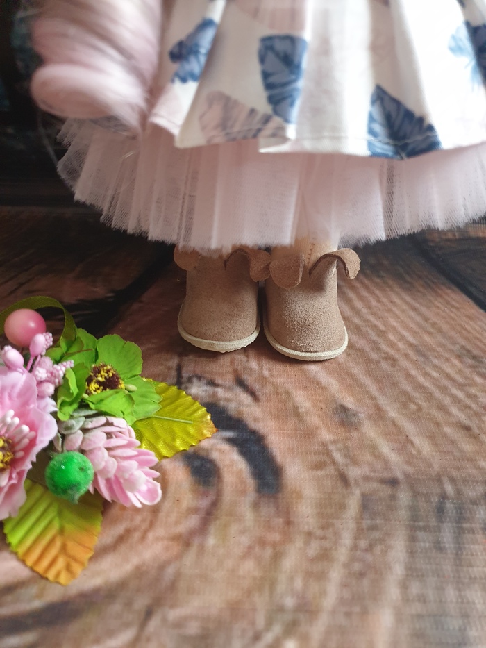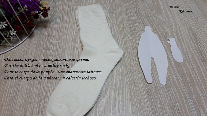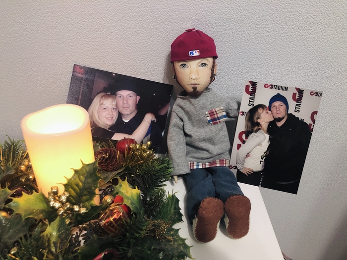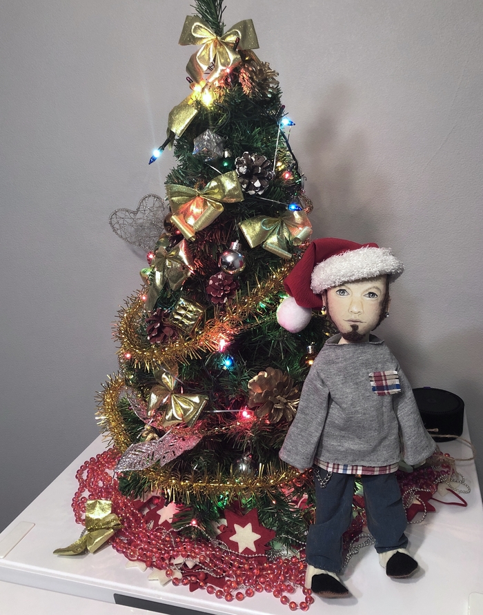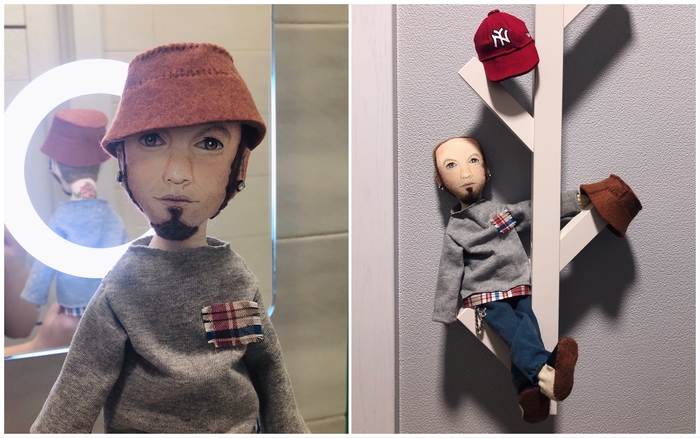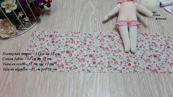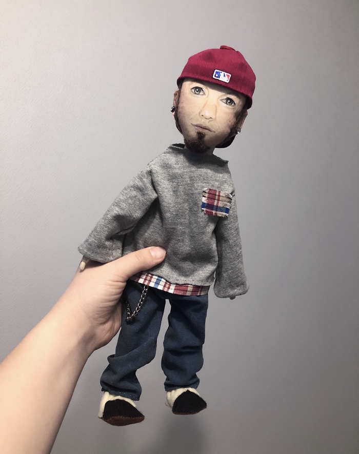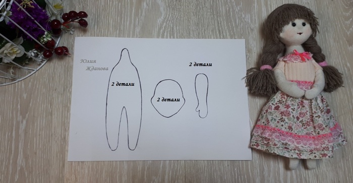 Сделан из хлопка, набивка - синтепух, волосы - тонкая шерсть. Рост 31 см.