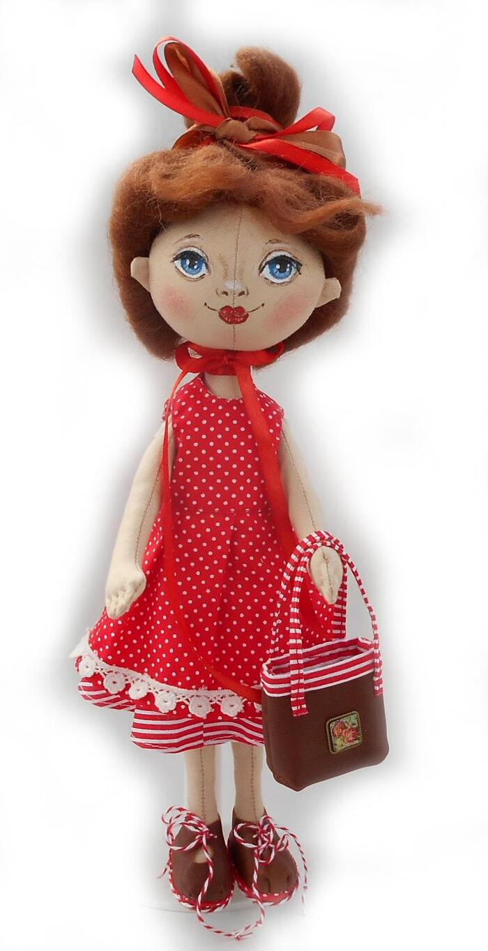 Эта особа в красном оказалась капризной. Так иногда бывает с куклами hand made. Сшитая куколка не выглядит законченной/довольной/правильной. Меняешь причёску, наряд. Кукла продолжает "капризничать". Но в этот раз потенциальная заказчица предложила свои изменения. Идея оказалась удачной и игрушка уехала в новый дом.