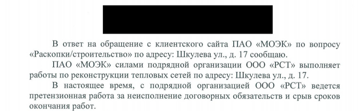 2) ПАО МОЭК. Дочка "Газпрома", получила заказ от города на реконструкцию разводящих тепловых сетей. В частности коммуникации внутри нашего двора (4 старых дома)